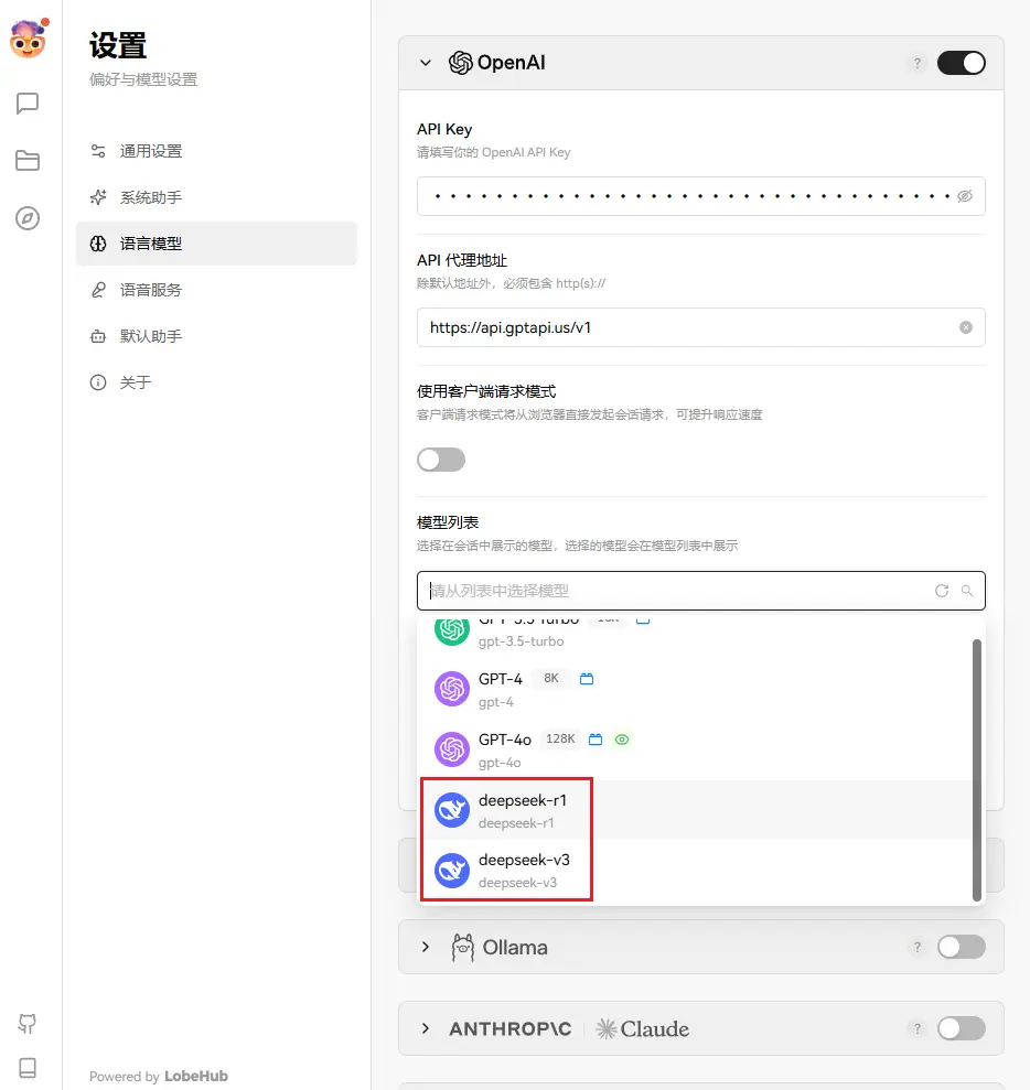 # 如果你使用 gptapi.us,在首页的表格会显示各个模型的名称,比如 deepseek-r1,那就用 +deepseek-r1,直接用 lobechat 里的 deepseek 不行