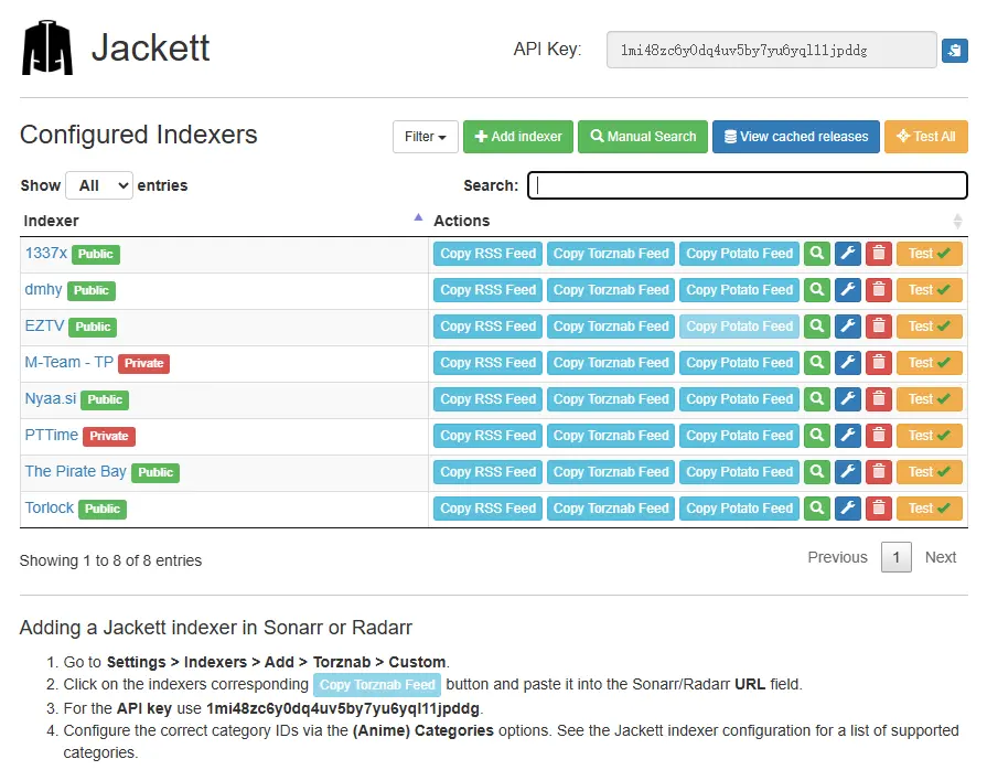 Jackett 的用途有两个:一个是可以直接在 Jackett 中进行搜索,另一个就是给其他工具提供信息源。