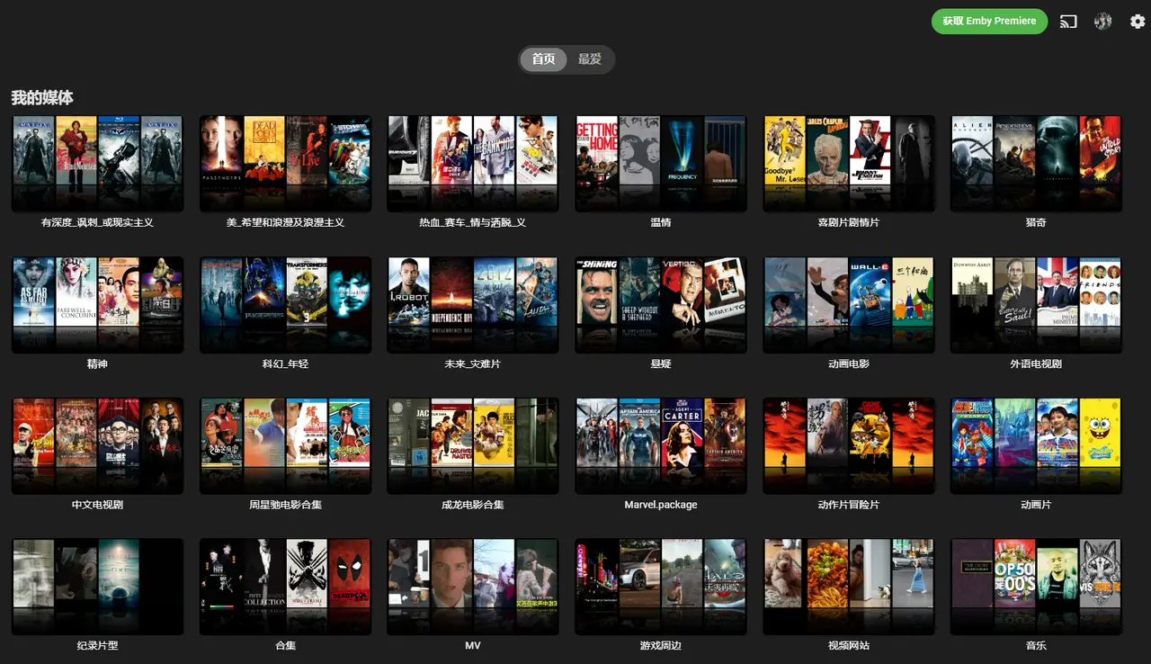 如图,电影分成十几个媒体库,电视分为 3 个:中文电视剧、外语电视剧和动画片,此外还有 MV、音乐等,每个媒体库都对应一个目录或多个目录。