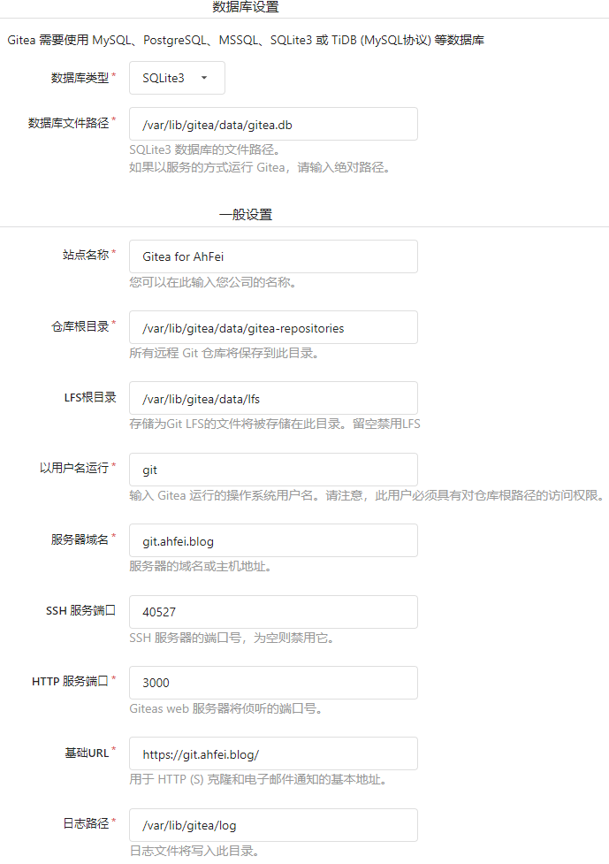 数据库类型选 SQLite3,数据库文件路径输入 /var/lib/gitea/data/gitea.db ,其他默认或按需更改。